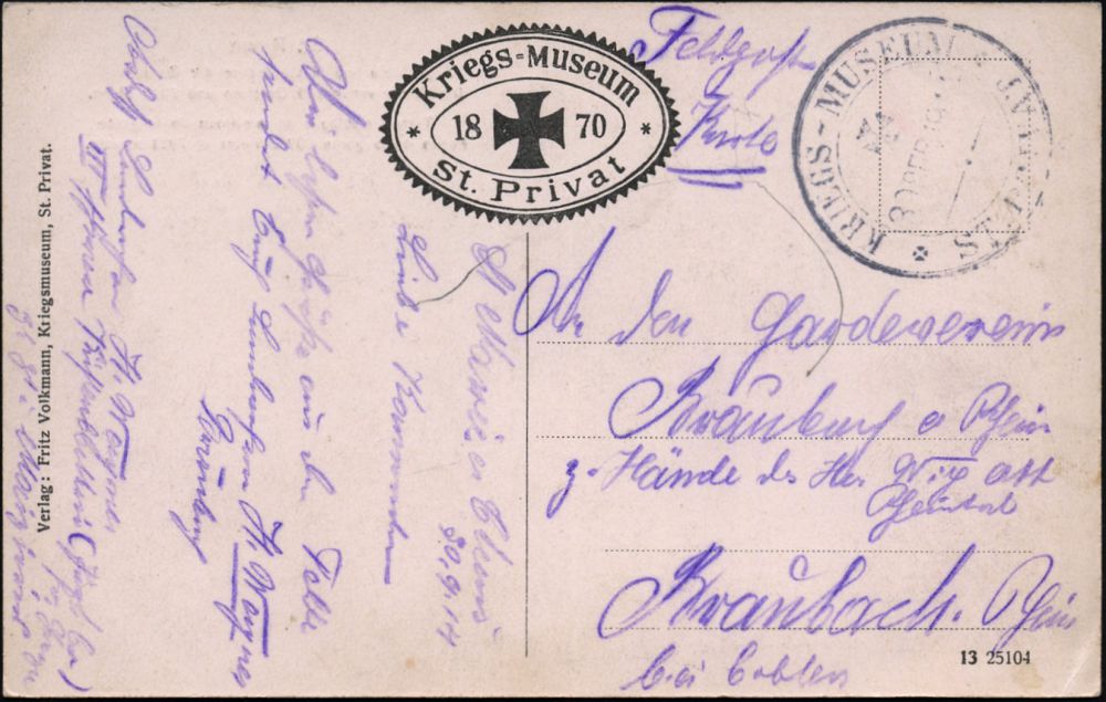 36 | 12 € | DEUTSCHE GESCHICHTE 1871 - 1914 : St.Privat 1914 (30.9.) 2K: KRIEGS-MUSEUM/ST. PRIVAT auf s/w.-Ak.: Kriegs-Museum 1870 St. Privat (Angriffsfeld u. Massengräber) Feldost-Kt. n. Braubach | ![]() ![]() | |