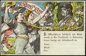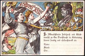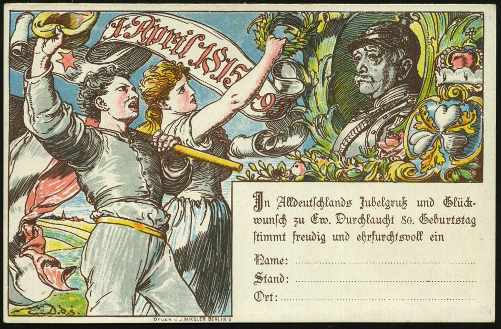 44 | 18 € | DEUTSCHE GESCHICHTE 1871 - 1914 : DEUTSCHES REICH 1895 PP 3 Pf. Ziffer Krone, braun: IN TRINITATE ROBUR.. dem Fürsten Bismarck = 80.Geburtstag (ohne Golddruck u.Arabesken) Abb: Bismarck mit Pickelhaube, Rosen, Krone, Jubelpaar m.Flagge etc., ungebr. (Mi.PP 8/C1-03) | ![]() ![]() | |