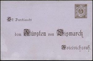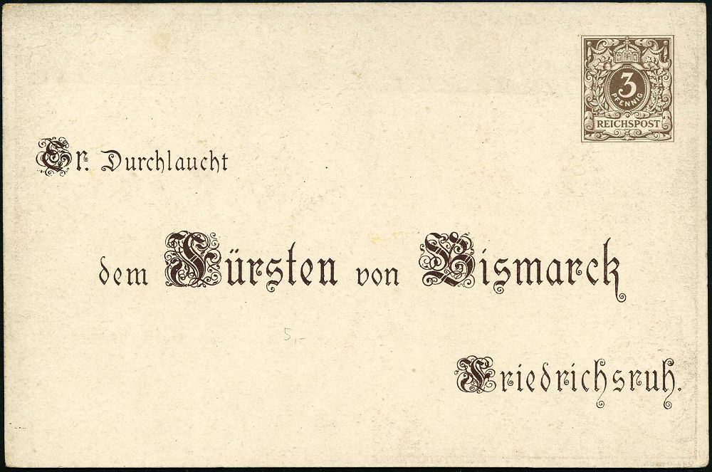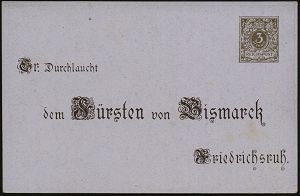 45 | 18 € | DEUTSCHE GESCHICHTE 1871 - 1914 : DEUTSCHES REICH 1895 (1.4.) PP 3 Pf. Krone, braun/lila: Sr. Durchlaucht dem Fürsten von Bismarck.. = Bismarck-Büste m. Kürass u. Pickelhaube (u. Jubel-Paar mit Flagge, Rosen) = 80. Geburtstag von Bismarcks (rs. kl. Eckschürfung) ungebr. (Mi.PP 8/C 1-05) | ![]() ![]() | |