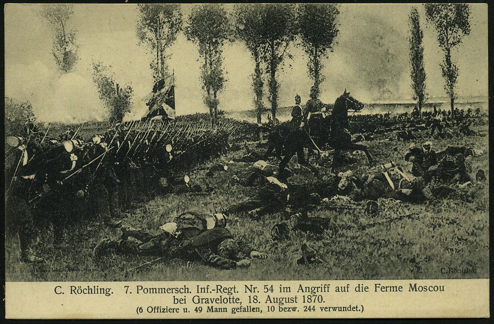 59 | 12 € | DEUTSCHE GESCHICHTE 1871 - 1914 : DEUTSCHES REICH 1913 s/w.-Künstler-Ak.: 7. Pommersch. Inf.-Regt. Nr. 54.. bei Gravelotte 1870 von C. Röchling, ungebr. (Verlag Rud. Lupus, Metz) | ![]() | |
