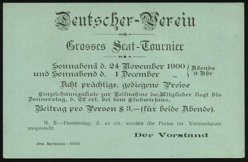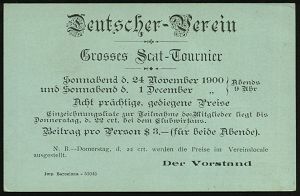 64 | 20 € | DEUTSCHE GESCHICHTE 1871 - 1914 : CHILE 1900 (19.11.) amtl. P1 C. Columbus, grün + rs. Zudruck: Deutscher Verein/ Grosses Skat-Turnier.. , 2K: SANTIAGO, seltene Ortskt. | ![]() ![]() | |