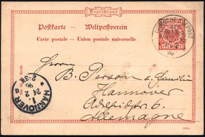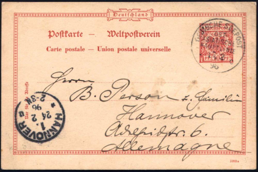 46 | 35 € | DEUTSCHE GESCHICHTE 1871 - 1914 : DEUTSCHES REICH 1896 (17.2.) 1K-BPA: DEUTSCHE SEEPOST/OST-/ASIATISCHE/AUPTLINIE/* c klar auf Ausl.-P 10 Pf. Adler (geringes Fleckchen), hs. Abs.: D "Preussen" aus Port Said n. Hannover (Mi.P 25) | ![]() | |