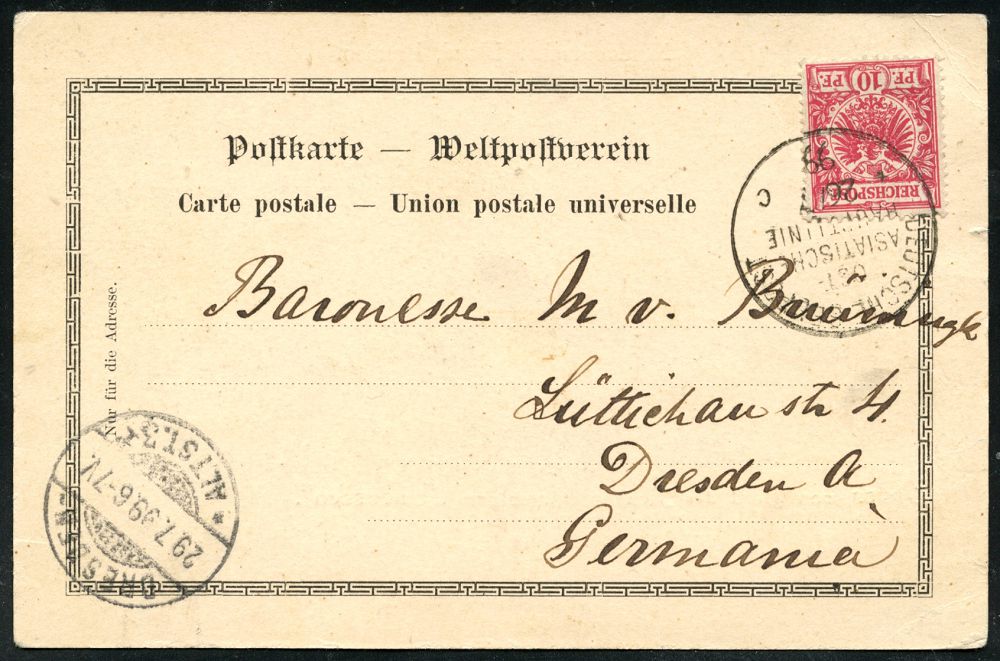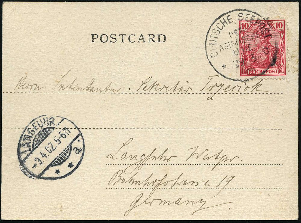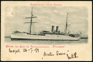 47 | 35 € | DEUTSCHE GESCHICHTE 1871 - 1914 : DEUTSCHES REICH 1899 (26.7.) 1K-BPA: DEUTSCHE SEEPOST/OST-/ASIATISCHE/HAUPTLINIE/* c = Reichspostdampfer "Preussen" , klar gest. zweifarbige Schiff-Ak. aus Neapel n. Dresden, vs. AS. | ![]() ![]() | |