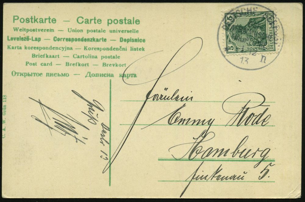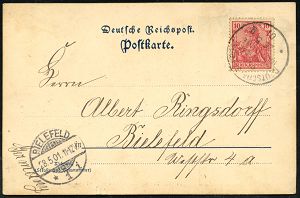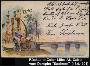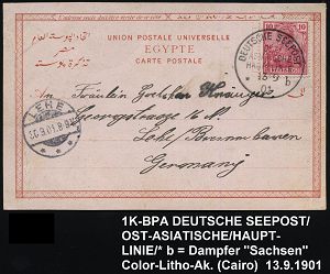 50 | 25 € | DEUTSCHE GESCHICHTE 1871 - 1914 : DEUTSCHES REICH 1901 (13.9.) 1K-BPA: DEUTSCHE SEEPOST/OST-/ASIATISCHE/HAUPTLINIE/* b = Dampfer "Sachsen" klar auf EF 10 Pf. Germania (Mi.56, EF) Übersee-Color-Litho-Ak: Cairo (Beförd.-Spuren) n. Lehe , vs. AS | ![]() ![]() | |