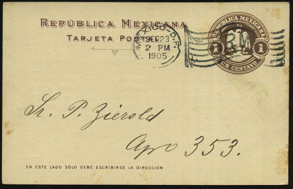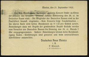 67 | 20 € | DEUTSCHE GESCHICHTE 1871 - 1914 : MEXICO / DEUTSCHES REICH 1905 (21.9.) amtl. P 1 C. braun "Staatswappen Mexico" + Zudruck: Auslands-Besuch Kreuzer "Bremen", Einladung für Konzert (Musikverein "Germania") Flaggen-MaSt.: MEXICO-D.F./R.M. (Bickerdike) Ortskt. | ![]() ![]() | |