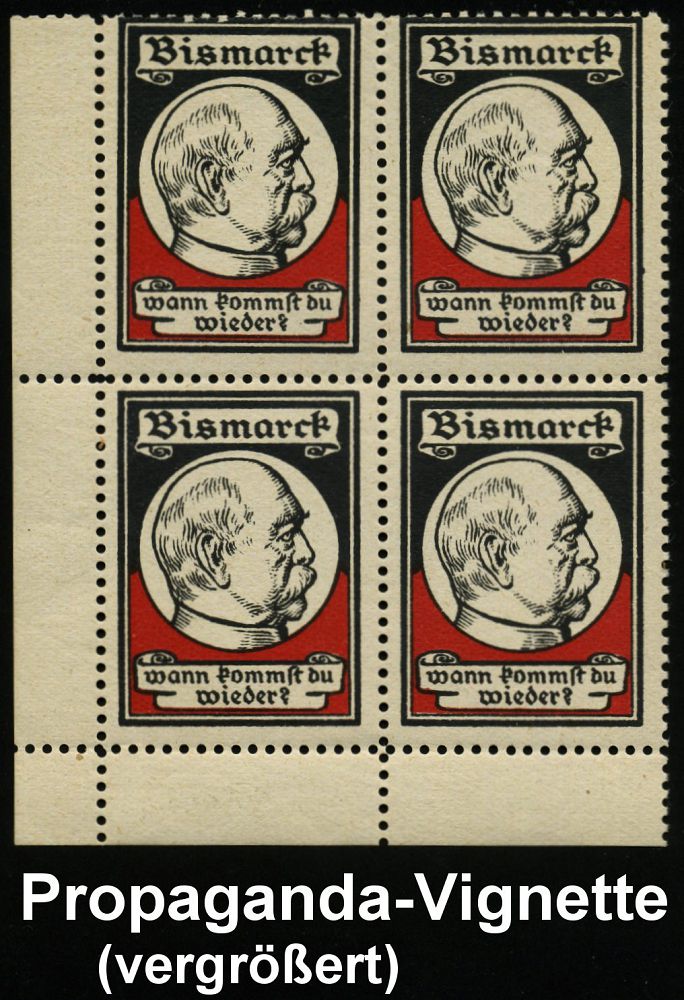 61 | 30 € | DEUTSCHE GESCHICHTE 1871 - 1914 : DEUTSCHES REICH 1930 (ca.) deutsch-nationale Propaganda-Vignetten: Bismarck wann konmmst du wieder?, Bogen-Eckrand-4er-Block , orig.G. (Einzelausruf möglich: je 12.- EUR) | ![]() | |