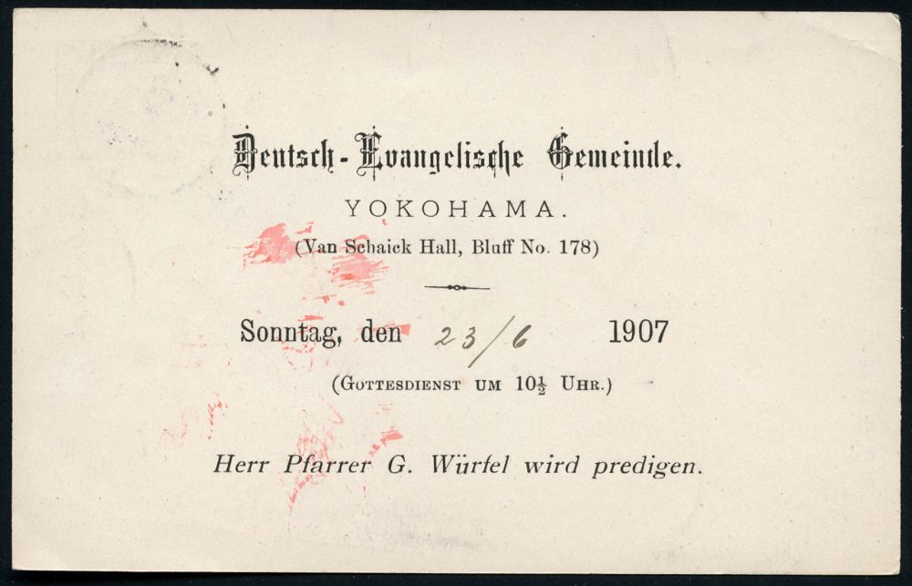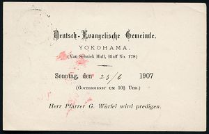 66 | 18 € | DEUTSCHE GESCHICHTE 1871 - 1914 : JAPAN / DEUTSCHES REICH 1907 (19.6.) amtl. P 10 Sen. "Kiku", blau + rs. deutscher Zudruck: Deutsche Evangelische Gemeinde, YOKOHAMA , Einladungs-Kt. zum Gottesdienst, Bedarf! | ![]() ![]() | |