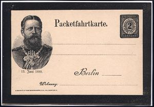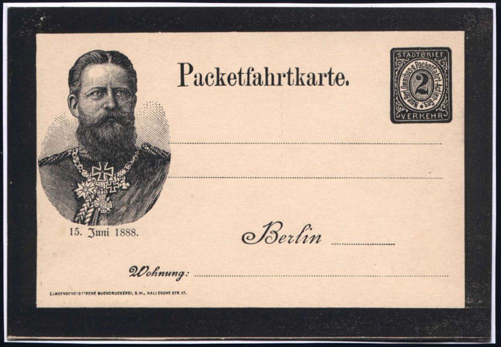 3 | 18 € | DEUTSCHE GESCHICHTE 1871 - 1914 : Berlin 1888 "Neue Berliner Omnibus- u. Packetfahrt AG.", Sonder-P 2 Pf. Trauerkarte ,schw.: 15. Juni 1888 zum Tode Kaiser Friedr. III. (Brustbild m.Orden) ungebr. (ME.P 19) | ![]() | |