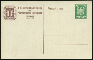 23 | 20 € | DEUTSCHE GESCHICHTE 1871 - 1914 : Hamburg 1925 (Aug.) PP 5 Pf. Adler, grün: 31. Deutscher Philatelistentag = Bismarck-Denkmal , ungebr. (Mi.PP 81/C 8-09) | ![]() ![]() | |