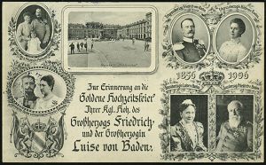25 | 16 € | DEUTSCHE GESCHICHTE 1871 - 1914 : KARLSRUHE/ *(BADEN)2/ a 1906 (16.10.) 1K-Gitter auf s/w.-Jubil.-Ak.: Goldene Hochzeit Großherzog Friedrich.. Luise von Baden (6 Portraits, Schloß, Wappen), seltene Bedarfs-Kt.! (Mi.85 I) | ![]() ![]() | |