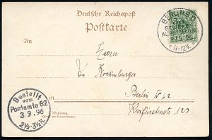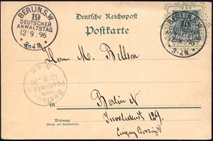 6 | 40 € | DEUTSCHE GESCHICHTE 1871 - 1914 : BERLIN,S.W./ 19/ DEUTSCHER/ ANWALTSTAG/ ** 1896 (12.9.) seltener SSt auf PP 5 Pf. Krone, grün mit Zierrahmen "1896 Gewerbe-Ausstellung" (Mi.PP 9/C 3-03) glasklar gest. Bedarfs-Orts-Kt. (BHW. S 18 / Bo.15) | ![]() | |