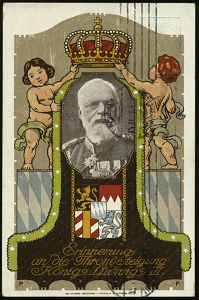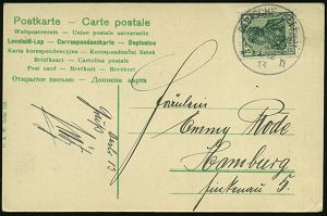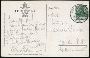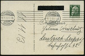 27 | 20 € | DEUTSCHE GESCHICHTE 1871 - 1914 : LUDWIGSHAFEN/ (Rhein)1 1913 (12.11.) Band-MaSt. auf PP 5 Pf. Luitpold, grün: Jubil. Thronbesteigung König Ludwig III. (in Uniform, Orden, Putten m. Krone, Wappen) Bedarf!, rs. Buchdruck-Schwärzung "Postkarte" (Frech.PP 27/D 2) | ![]() ![]() | |