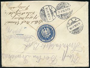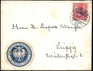 7 | 50 € | DEUTSCHE GESCHICHTE 1871 - 1914 : BERLIN,W./ *35c 1900 (26.10.) 1K-Gitter + blaue Siegel-Oblate: DER REICHS-KOMMISSAR/IN PARIS 1900 (Reichsadler) Inl.-Dienstbf. (schwacher Fleck) an Dr. Leopold Wenger, Leipzig, = auch zuständig für die Olympischen Spiele 1900, sehr seltener Beleg! seltener Beleg! (Mi.56 EF) | ![]() | |