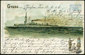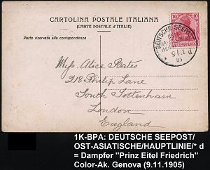 53 | 35 € | DEUTSCHE GESCHICHTE 1871 - 1914 : DEUTSCHES REICH 1905 (9.11.) 1K-BPA: DEUTSCHE SEEPOST/OST-/ASIATISCHE/HAUPTLINIE/*d mit provis. kleiner Jahrezahl (05) = Dampfer "Prinz Eitel Friedrich" auf EF 10 Pf. Germania auf Color-Foto-Ak. (Genova) n. London (Mi.71) | ![]() ![]() | |