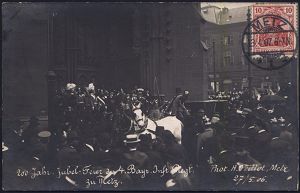 29 | 16 € | DEUTSCHE GESCHICHTE 1871 - 1914 : METZ/ +1k 1907 (13.4.) 1K-Gitter vs. a. s/w.-Foto-Jubil.-Ak.: 200 Jahr Jubel-Feier d. 4. Bayer. Jnf. Regt. zu Metz , Bedarfs-Ausl.-Karte n. Paris (Mi.86 I) | ![]() ![]() | |