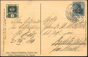 18 | 18 € | DEUTSCHE GESCHICHTE 1871 - 1914 : DRESDEN 1911/ a/ INTERN.HYGIENE-/ AUSSTELLUNG 1911 (24.8.) SSt klar auf offiz. Ausstellungs-Sonder-Kt. Nr. 88: Chines. Staatspavillon mit Pagode , Bedarf! (Bo.18 II = UB "a") | ![]() ![]() | |