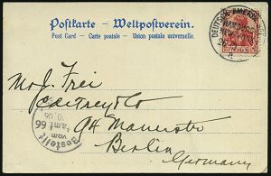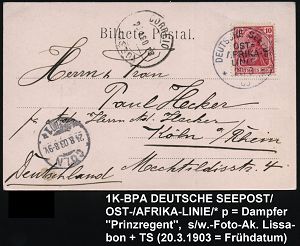 52 | 30 € | DEUTSCHE GESCHICHTE 1871 - 1914 : DEUTSCHES REICH 1903 (20.8.) 1K-BPA: DEUTSCHE SEEPOST/OST=/AFRIKA-/LINIE/*p = Dampfer "Prinzregent" , klar gest. EF 10 Pf. Germania, auf s/w.-Foto-Ak. Lissabon (TS: LISBOA) n. Köln (AS), frühes Datum! (Mi.71 EF) | ![]() ![]() | |