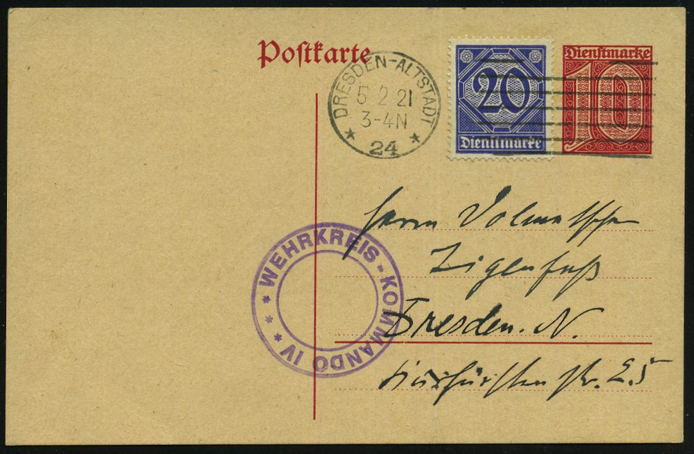 963 | 15 € | DIE REICHSWEHR (1919-35) : DRESDEN-ALTSTADT/ *24* 1921 (5.2.) MaStrichSt auf DP 10 Pf. + 20 Pf. Dienst Zusatzfrank. + viol.2K-HdN: WEHRKREIS-KOMMANDO IV, klar gest. Reichswehr-Ortskt. (Mi.DP 1, D 20) | ![]() | |