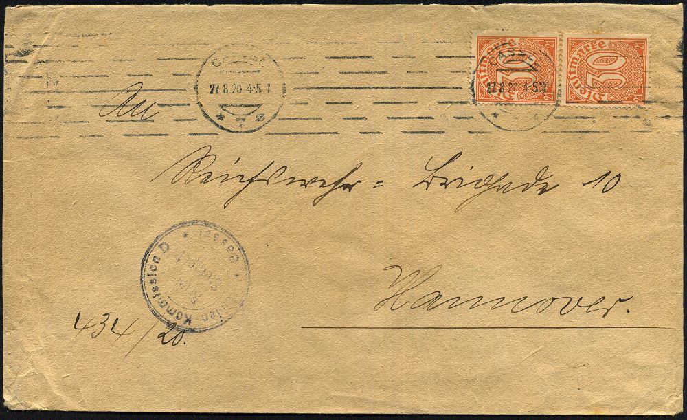 965 | 18 € | DIE REICHSWEHR (1919-35) : Kassel 1920 (27.8.) Band-MaSt.: CASSEL/* 7 z auf Dienst 30 Pf. Paar + viol. 3K-HdN: Linien-Kommission D/ Cassel = Behörde für Militrätransporte (Feldeisenbahnwesen) Wende-Dienstbf. (doppelt verwendet) an Reichswehr Hannover (Mi.D 20 MeF) | ![]() | |