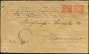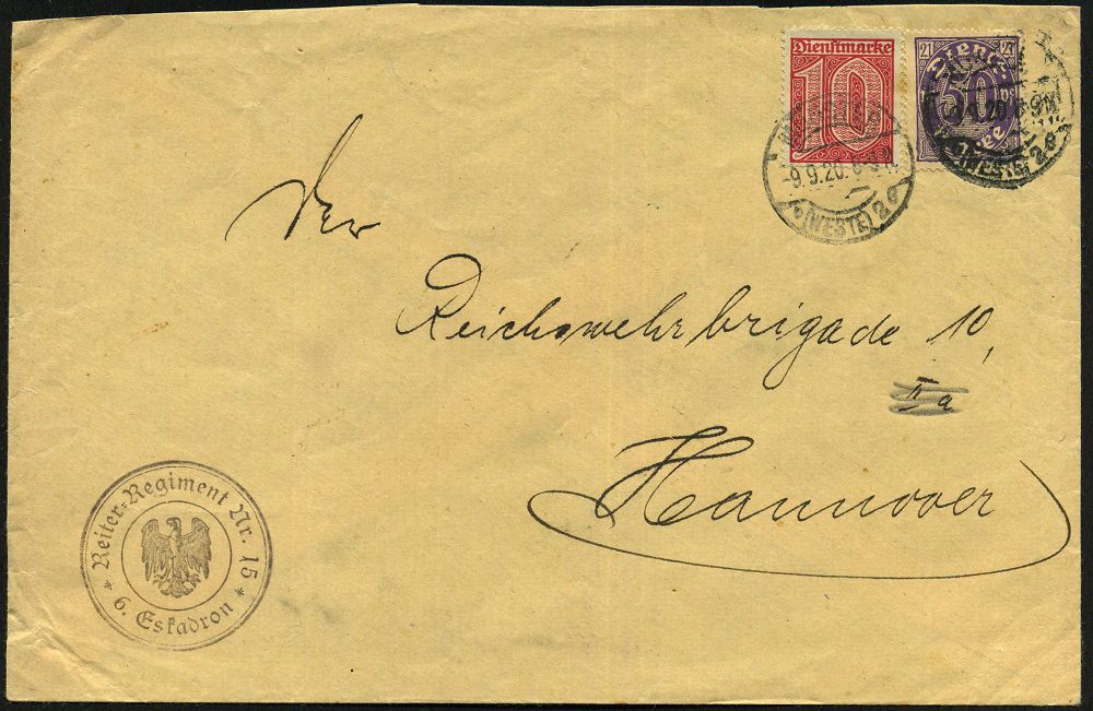 968 | 16 € | DIE REICHSWEHR (1919-35) : MÜNSTER/ *(WESTF.) 2/ i 1920 (9.9.) 1K-Brücke auf Dienst 10 Pf. u. 50 Pf. + viol. 3K-HdN: Reiter-Regiment Nr. 15/ 6. Eskadron (Weimarer Adler) Dienst-Bf. n. Hannover (Mi.D 21, D 24) | ![]() | |