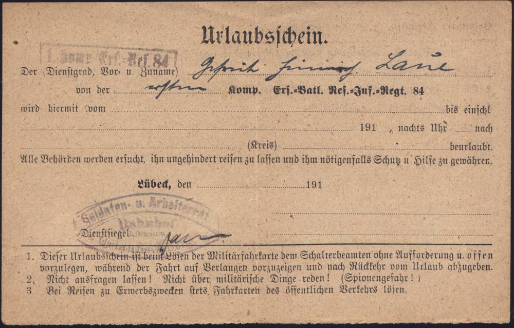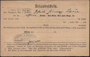 966 | 30 € | DIE REICHSWEHR (1919-35) : Lübeck 1918 Urlaubsschein Res. Inf.-Regt. 84 mit Schnallen-HdN: Soldaten- u. Arbeiterrat/Bahnhof/Lübeck , seltenes Dokument! | ![]() | |