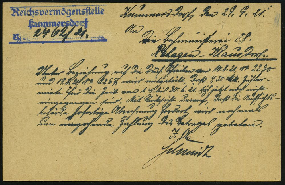 970 | 15 € | DIE REICHSWEHR (1919-35) : REHAGEN/ (Militärbahn) 1921 (30.9.) 1K-Brücke auf DP 10 Pf. (kl. Mäng.) + Zusatzfrank. Dienst 30 Pf. + bl. HdN: Reichsvermögensstelle/ Kummersdorf + rs. blauer 3L: Reichsvermögensstelle... Ortskt., die Militärbahn zum Militär-Versuchsstation Kummersdorf (Mi.DP 4, Mi.D 20) | ![]() ![]() | |
