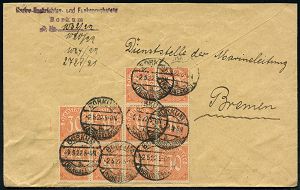 969 | 15 € | DIE REICHSWEHR (1919-35) : PADERBORN/ **f 1921 (21.12.) 1K-Brücke mehrfach auf Dienst 10x 15 Pf., 2x 10 Pf. u. 60 Pg. + viol. 2K-HdN: Jnfanterie-Regiment Nr. 18. , großer Dienst-Bf.: Jnfanterie-Regiment 18.. (2 gefaltet) n. Hannover (Mi.2x D 24, 10x D 25, D 66) | ![]() | |