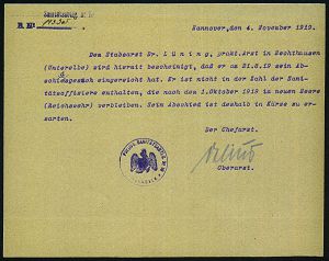 964 | 16 € | DIE REICHSWEHR (1919-35) : Hannover 1919 (4.11.) Entlassungs-Dokument eines Militär-Arztes, der nicht in die Reichswehr übernommen wurde (rs. etw. gestützt) aptiertes Dienst-Siegel: PREUSS SANITÄTSABTLG. No. 16/Hannover ("KÖNIGL." entfernt) Signatur Chefarzt (Format 20,5 x 16,5 cm) | ![]() | |