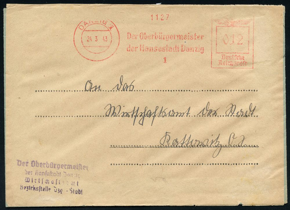 1196 | 35 € | FREIE STADT DANZIG (1920 - 1939) & DANZIG BIS 1944 : DANZIG 1/ Der Oberbürgermeister/ der Hansestadt Danzig/ 1 1943 (24.3.) seltener AFS Francotyp Reichsadler + viol. Abs.-4L: ..Hansestadt Danzig/Wirtschaftsamt , Recycling-Fern-Bf. (Handbuch Nr.293) | ![]() | |