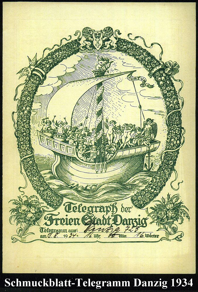 1203 | 280 € | FREIE STADT DANZIG (1920 - 1939) & DANZIG BIS 1944 : DANZIG 1934 (Aug.) Schmuckblatt-Telegramm "Telegraph der Freien Stadt Danzig" (grün): Hanse-Kogge mit musizierenden Putten (Amor mit Pfeil u. Bogen, Rosen-Füllhörner, Wappen etc.) als Orts-Telegr. gebr., erstklassige Erhaltung!, selten! (ME.Nr. 2 , L p. !) | ![]() | |