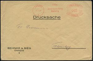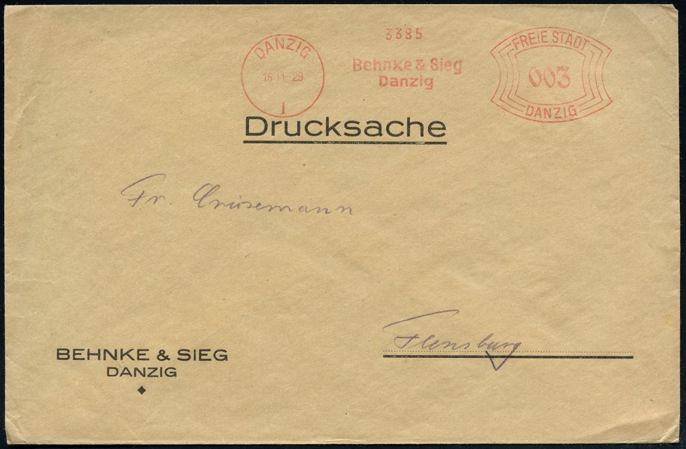 1171 | 25 € | FREIE STADT DANZIG (1920 - 1939) & DANZIG BIS 1944 : DANZIG/ 1/ BEHNKE & SIEG/ Danzig 1929 (16.11.) AFS Francotyp "Bogenrechteck" 003 Pf. auf Firmen-Bf. (Handbuch Nr.006) | ![]() | |