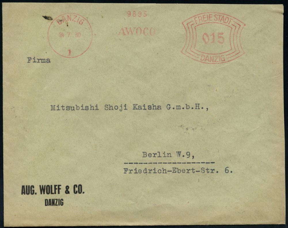 1169 | 28 € | FREIE STADT DANZIG (1920 - 1939) & DANZIG BIS 1944 : DANZIG/ 1/ AWOCO 1930 (24.7.) AFS Francotyp "Bogenrechteck" 015 Pf. = AUG. WOLF & CO (rs.Klappenriß) rs. Reklame-Abb.: Hafenanlage Danzig, Fern-Bf. (Handbuch Nr.57) | ![]() ![]() | |