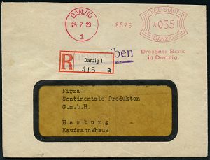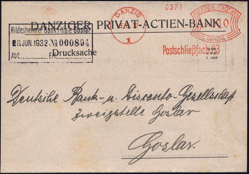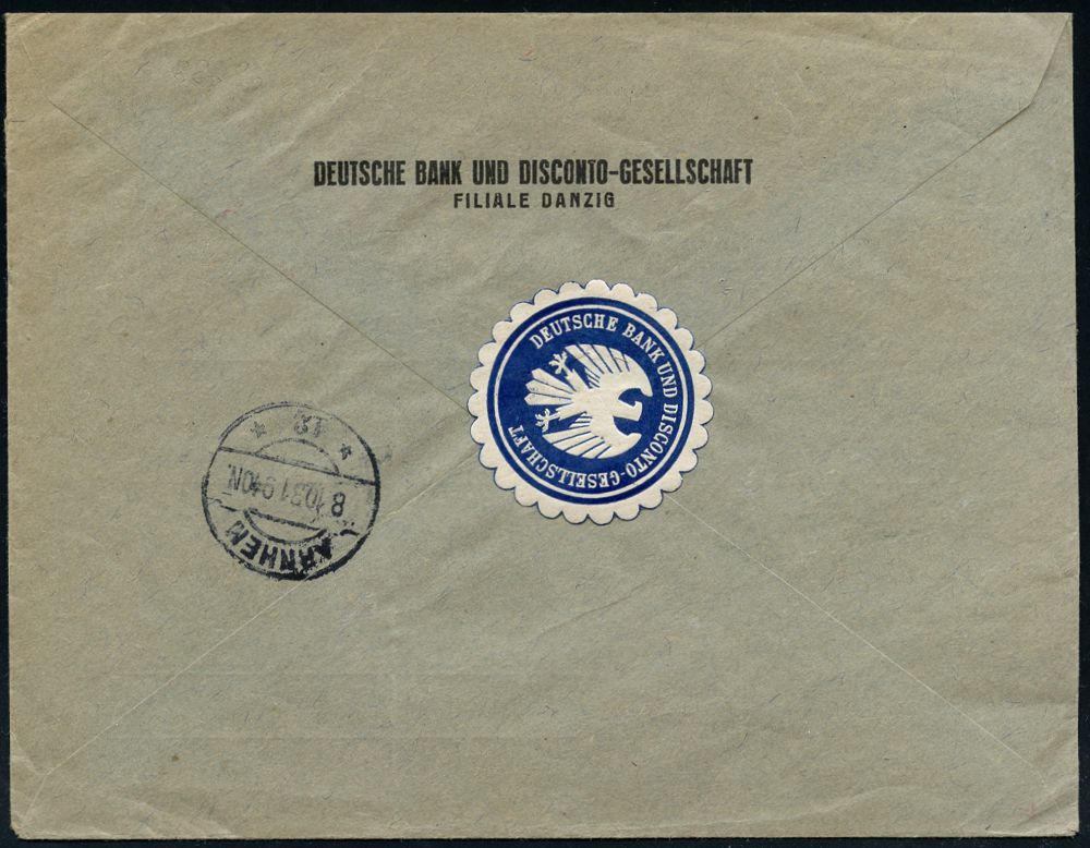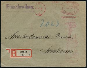 1174 | 40 € | FREIE STADT DANZIG (1920 - 1939) & DANZIG BIS 1944 : DANZIG/ 1/ POSTSCHLIESSFACH 75 1931 (7.10.) AFS Francotyp "Bogenrechteck" 075 Pf. + RZ: Danzig 1/a , rs. Abs.-Vordruck: DEUTSCHE BANK U. DISCONTO-GES., FILIALE DANZIG + blaue Bank-Siegel-Oblate, Ausl.-R-Bf. n. Amsterdam, seltene Portostufe! (Handbuch Nr.024) | ![]() ![]() | |