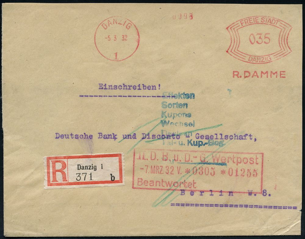 1176 | 30 € | FREIE STADT DANZIG (1920 - 1939) & DANZIG BIS 1944 : DANZIG/ 1/ R.DAMME 1932 (5.3.) AFS Francotyp "Bogenrechteck" 035 Pf. + RZ: Danzig 1/b , rs. Abs.-Vordruck, Fern-R-Bf. (minimal rechts verkürzt) an Deutsche Bank mit Eingangsstempel (Handbuch Nr.012) | ![]() | |