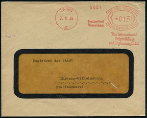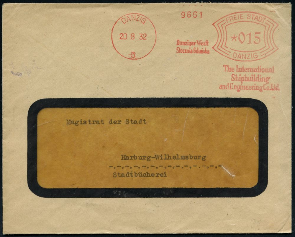1178 | 40 € | FREIE STADT DANZIG (1920 - 1939) & DANZIG BIS 1944 : DANZIG/ 5/ Danziger Werft/ Stocznia Gdanska/ The International/ Shipbuilding/ and Engineering Co.Ltd. 1932 (20.8.) AFS Francotyp "Bogenrechteck" 015 Pf. , rs. Abs. + dekorative Reklame Dieselkraftmaschine, Fern-Bf. (Dü.E-1Ah) | ![]() ![]() | |