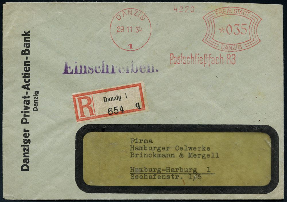 1180 | 40 € | FREIE STADT DANZIG (1920 - 1939) & DANZIG BIS 1944 : DANZIG/ 1/ Postschließfach 83 1934 (29.11.) AFS Francotyp "Bogenrechteck" 035 Pf. + Danzig 1/q + rs. rote Siegel-Oblate: DANZIGER PRIVAT ACTIEN BANK/ DANZIG, Fern-R-Bf. (Dü.E-1Ah) | ![]() ![]() | |