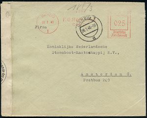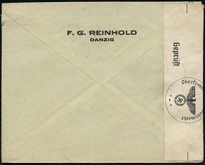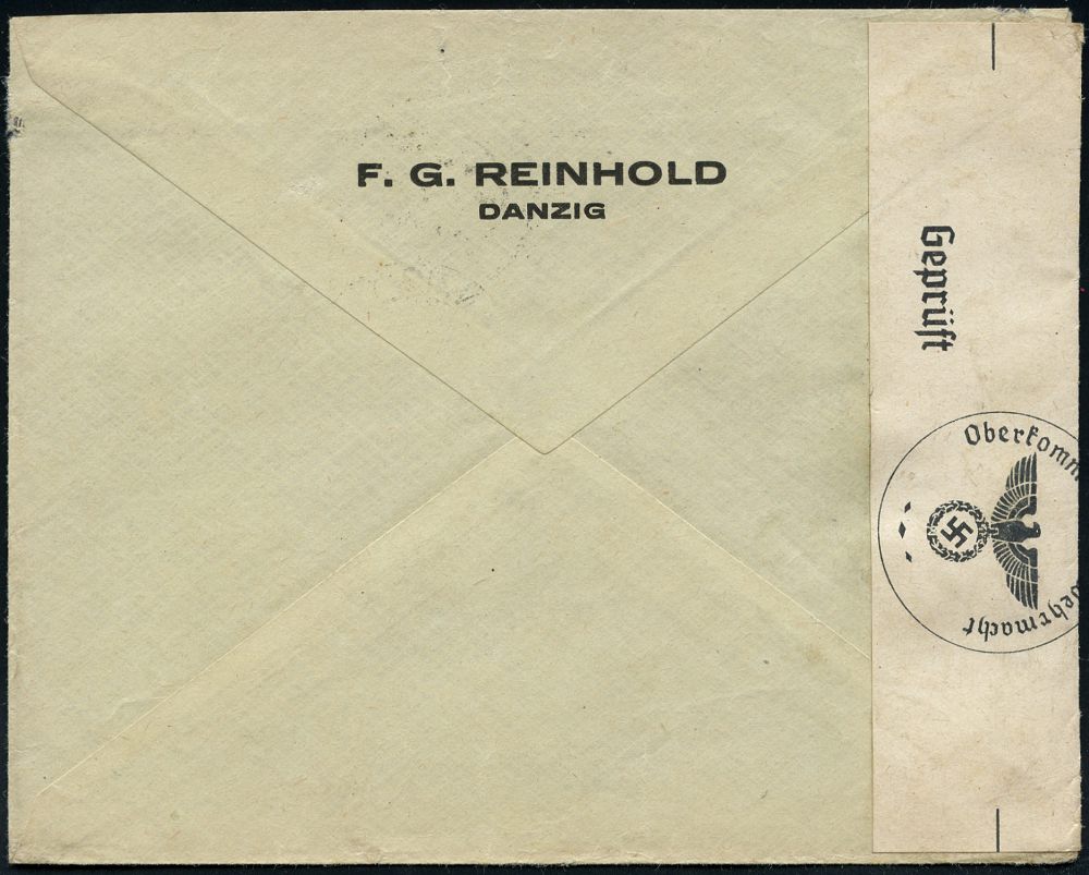 1191 | 35 € | FREIE STADT DANZIG (1920 - 1939) & DANZIG BIS 1944 : DANZIG/ 1/ F.G.Reinhold/ Danzig 1940 (27.1.) AFS Francotyp "Reichsadler" 025 Pf. + 2K-Steg: DANZIG 1/a + rs. OKW-Zensurstreifen "Geprüft" = Königsberg/Pr. (Rie.A-52, + 250 Pkte., nur Jan. bis März 1940 verwendet!, rs. Abs.-Vordruck, seltener Ausl.-Zensur-Bf. n. Amsterdam, während der "Sitzkrieg"-Periode im Westen! (Handbuch Nr.231) | ![]() ![]() | |