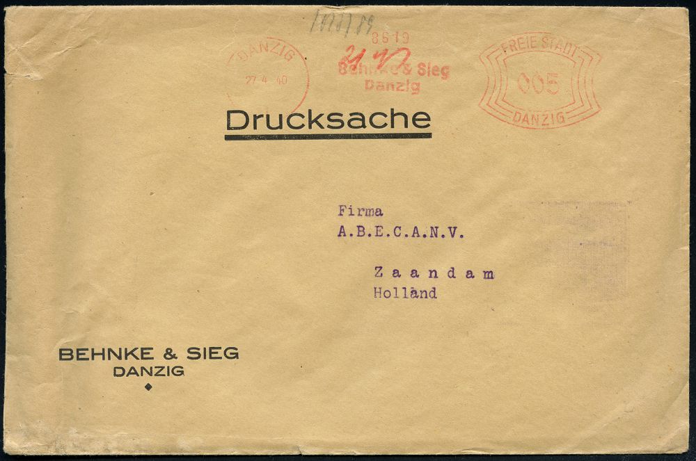 1192 | 40 € | FREIE STADT DANZIG (1920 - 1939) & DANZIG BIS 1944 : DANZIG/ 1/ Behke & Sieg/ Danzig 1940 (27.4.) AFS Francotyp "Bogenrechteck" 005 Pf. + rs. roter OKW-Zensur-1K: Geprüft = Köln (Rie.C-3 a, nur Febr. bis Juni 1940 verwendet!) + vs. hs. Zensur-Vermerk, Ausl.-Zensur-Bf. n. Holland während der "Sitzkrieg"-Periode im Westen (Handbuch Nr.049, 27.4. Handbuch unbekanntes Datum) | ![]() ![]() | |