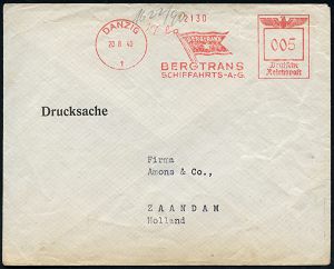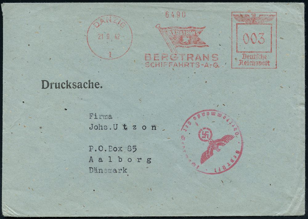 1195 | 45 € | FREIE STADT DANZIG (1920 - 1939) & DANZIG BIS 1944 : DANZIG/ 1/ BERGTRANS/ SCHIFFAHRTS-A.G. 1942 (21.9.) seltener AFS Francotyp "Reichsadler" 003 Pf. (Reederei-Flagge) rs. Abs.-Vordruck + vs. roter OKW-Zensur-1K: Geprüft = Hamburg (Rie.F-5 a + 500 Pkte.) Ausl.-Zenszr-Drs. n. Dänemark = Europa-Tarif = Inl.-Porto! (Handbuch Nr.204) | ![]() | |