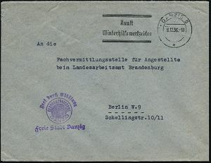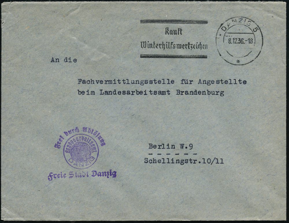 1185 | 18 € | FREIE STADT DANZIG (1920 - 1939) & DANZIG BIS 1944 : DANZIG 1936 (8.12.) seltener MWSt.: DANZIG 5/*/Kauft/Winterhilfsmarken + viol. HdN: FdA/Landesarbeitsamt/ DANZIG/ Freie Stadt Danzig (Wappen) Dienst-Bf. n. Berlin (Handbuch + 40.- EUR, 2004) | ![]() | |