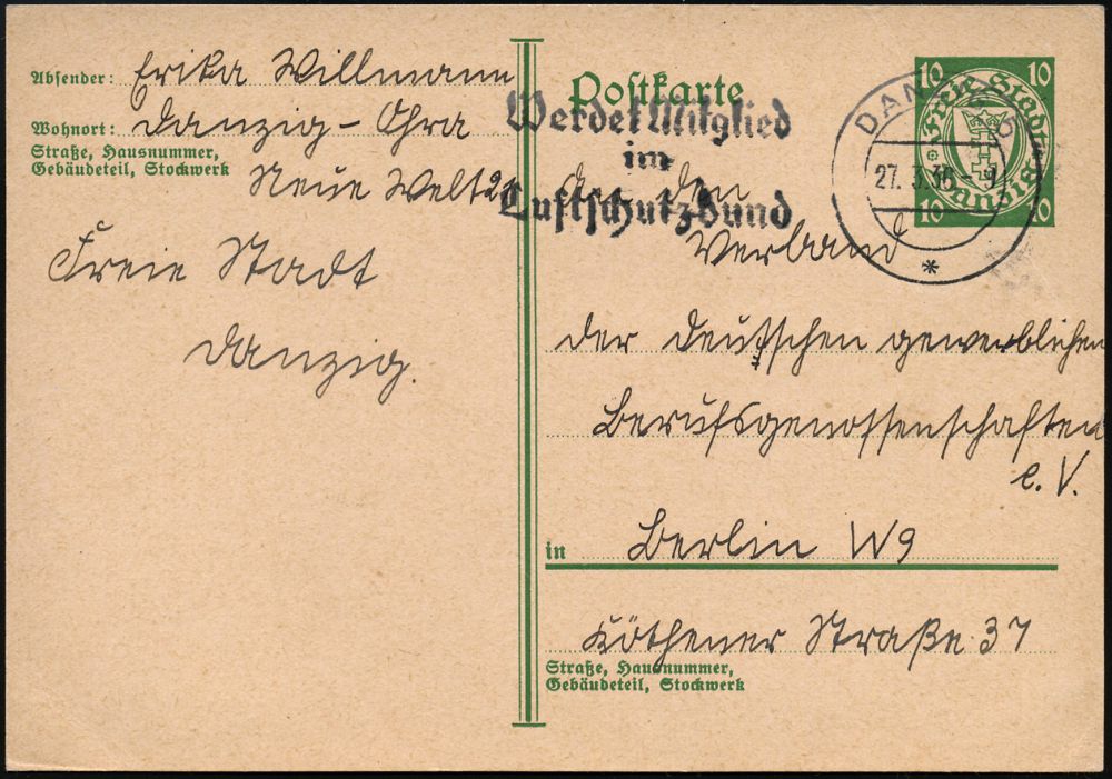 1184 | 15 € | FREIE STADT DANZIG (1920 - 1939) & DANZIG BIS 1944 : DANZIG 5/ *Werdet Mitglied/ im/ Luftschutzbund 1936 (27.3.) MWSt. klar auf P 10 Pf. Wappen, grün (Mi.P 42) Bedarf (Handbuch Nr.54.1) | ![]() | |