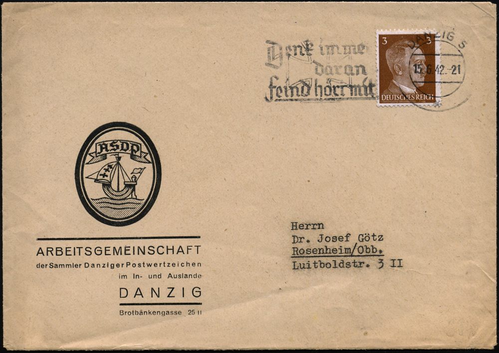 1194 | 20 € | FREIE STADT DANZIG (1920 - 1939) & DANZIG BIS 1944 : DANZIG 5/ */ Denk immer/ daran/ Feind hört mit 1942 (15.6.) MWSt (Eisernes Kreuz) dekorativer, illustrierter Vordruck-Bf. ArGe Danzig! (Bo.S 340 A, Handbuch Nr.17 A, + 70.- EUR) | ![]() | |
