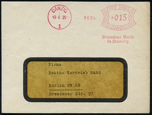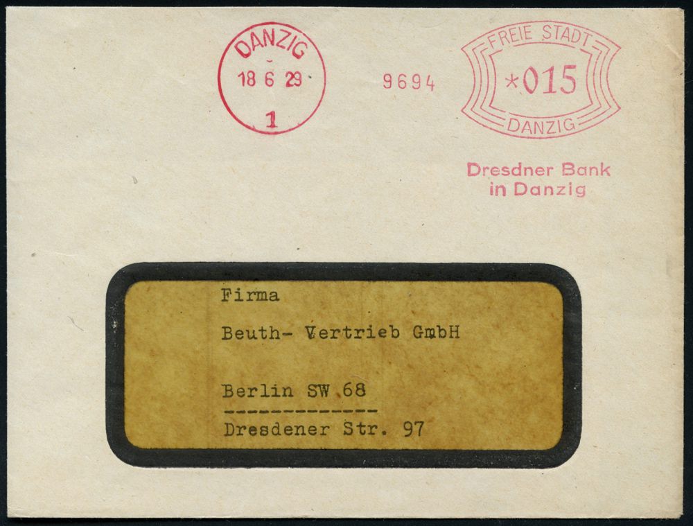 1168 | 40 € | FREIE STADT DANZIG (1920 - 1939) & DANZIG BIS 1944 : DANZIG/ 1/ Dresdner Bank/ in Danzig 1929 (18.6.) AFS Francotyp Bogenrechteck "FREIE STADT DANZIG" 035 Pf- + RZ: Danzg 1/a , rs. rote Siegeloblate: DRESDNER BANK in DANZIG.. (Monogr.-Logo) Fern-R-Bf. (Handbuch Nr.26) | ![]() ![]() | |