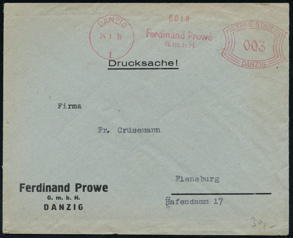 1173 | 25 € | FREIE STADT DANZIG (1920 - 1939) & DANZIG BIS 1944 : DANZIG/ 1/ Ferdinand Prove/ GmbH 1931 (24.1.) AFS Francotyp Bogenrechteck "FREIE STADT DANZIG" , Firmen-Bf. | ![]() | |