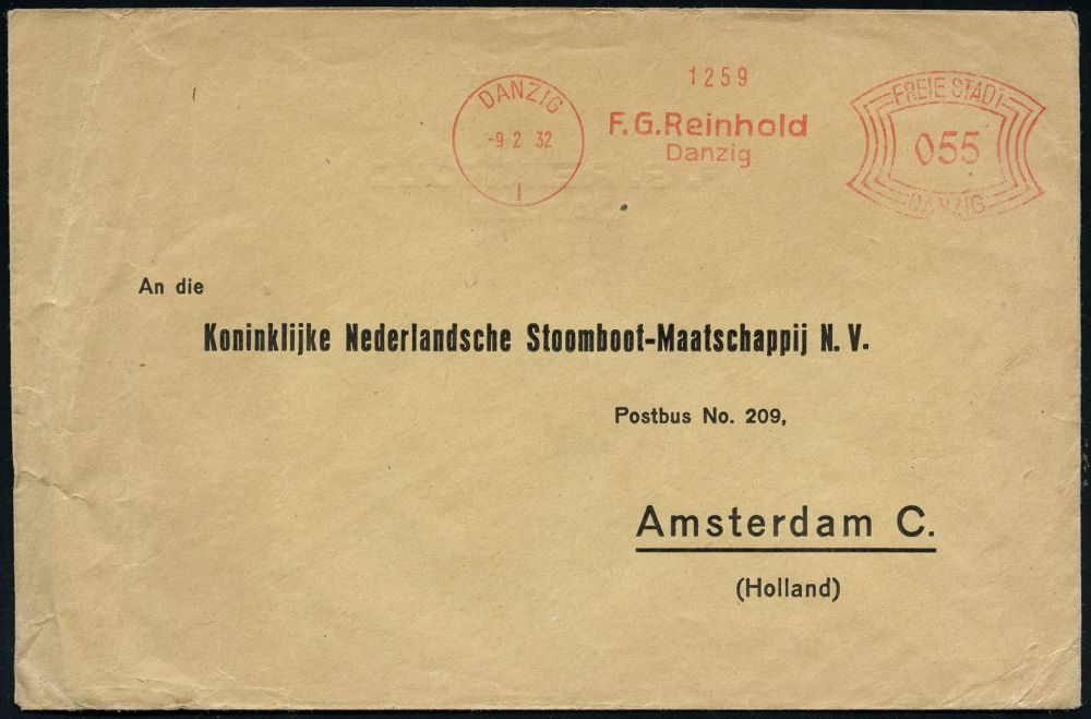 1175 | 25 € | FREIE STADT DANZIG (1920 - 1939) & DANZIG BIS 1944 : DANZIG/ 1/ F.G.Reinhold/ Danzig 1932 (9.2.) AFS Francotyp Bogenrechteck "FREIE STADT DANZIG" 055 Pf. , Ausl.-Doppel-Bf. n. Amsterdam!, seltene Portostufe! (Handbuch Nr.49) | ![]() | |