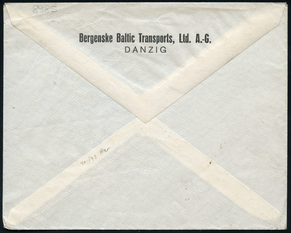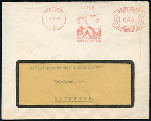 1187 | 35 € | FREIE STADT DANZIG (1920 - 1939) & DANZIG BIS 1944 : DANZIG/ 5/ PAM/ POLSKA AGENCIA/ MORSKA SP.ZO.O. 1938 (7.5.) seltener AFS Francotyp "Bogenrechteck" = Reederei (2 Fahrgastschiffe) Ausl.-Doppel-Bf., seltenes Porto! (Handbuch Nr.076) | ![]() | |