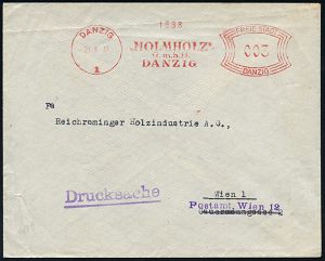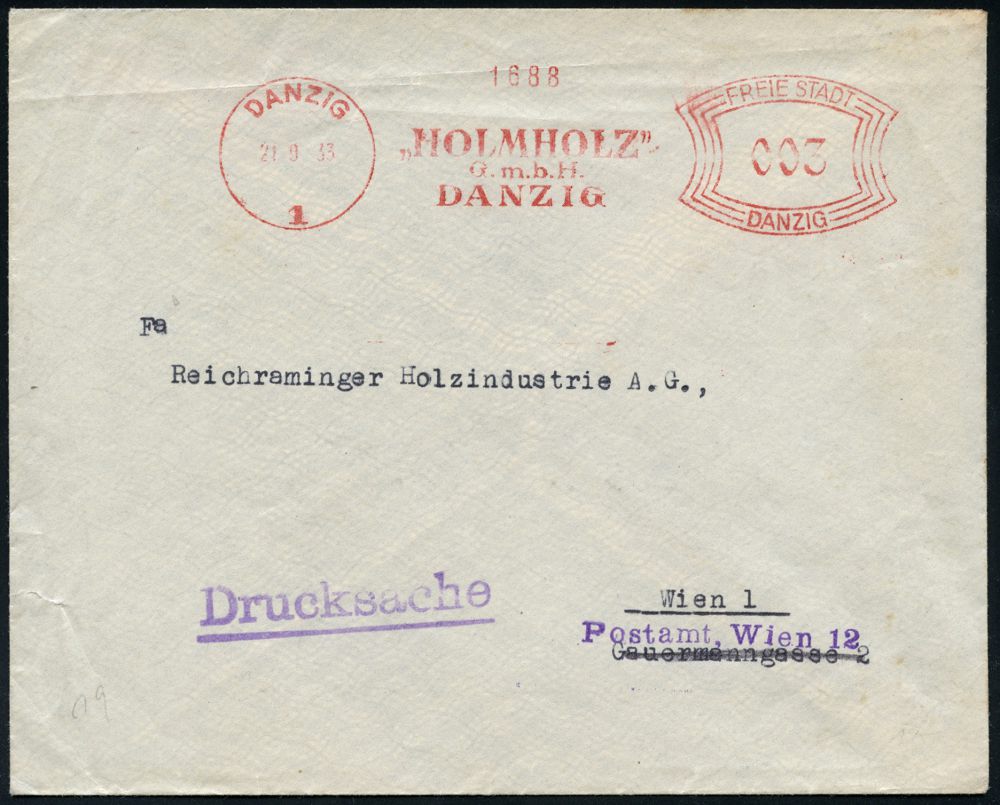 1179 | 30 € | FREIE STADT DANZIG (1920 - 1939) & DANZIG BIS 1944 : DANZIG/ 1/ "HOLMHOLTZ"/ GmbH/ DANZIG 1933 (21.9.) seltener AFS Francotyp "Bogenrechteck": FREIE STADT DANZIG auf Ausl.-Drs. n. Wien = Inl.-Tarif! (Handbuch Nr.36) | ![]() | |