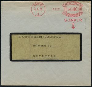 1188 | 28 € | FREIE STADT DANZIG (1920 - 1939) & DANZIG BIS 1944 : DANZIG/ 1/ S.ANKER 1939 (2.8.) AFS Francotyp "Bogenrechteck" *040 Pf. (Firmen-Logo: Anker) Ausl.-Doppel-Bf. n. Holland (Handbuch Nr.2) | ![]() | |