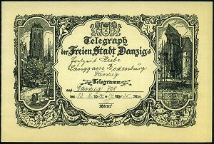 1202 | 250 € | FREIE STADT DANZIG (1920 - 1939) & DANZIG BIS 1944 : DANZIG 1934 (13.8.) Schmuckblatt-Telegramm "Telegraph der Freien Stadt Danzig" = Marienkirche u. Krantor (unten Putten, musizierend, Amor mit Pfeil u. Bogen, Wappen etc.) als Orts-Telegramm gebr., seltene, erstklassige Erhaltung! (ME.Nr. 1 , L p. !) | ![]() | |