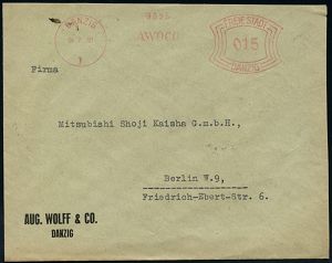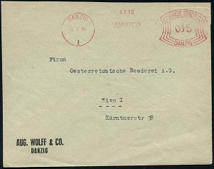1170 | 28 € | FREIE STADT DANZIG (1920 - 1939) & DANZIG BIS 1944 : DANZIG/ 1/ AWOCO 1935 (22.2.) AFS Francotyp "Bogenrechteck": FREIE STADT DANZIG = Fa. AUG. WOLFF & CO , rs. Abb. Firmenanlagen am Hafen mit Kränen u. Schiffen, Ausl.-Bf. n. Wien = Inl.-Tarif! (Handbuch Nr.57) | ![]() ![]() | |